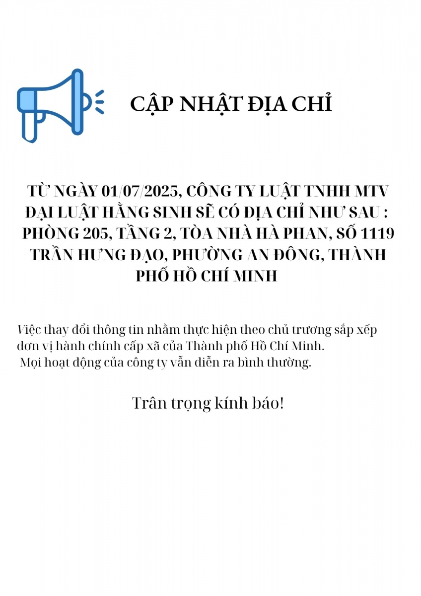 Cập nhật thông tin địa chỉ Công ty Luật TNHH MTV Đại Luật Hằng Sinh